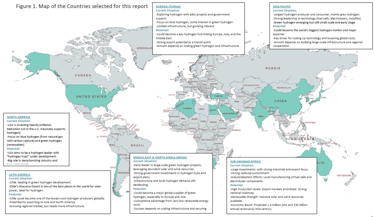The report draws on publicly available sources such as government documents, policy papers, and academic literature. Countries were selected based on their existing or emerging hydrogen strategies, investment levels, and relevance in global energy markets. The featured nations include Algeria, Australia, Chile, China, India, Japan, Morocco, Saudi Arabia, South Korea, Tunisia, Türkiye, UAE, USA, and South Africa.